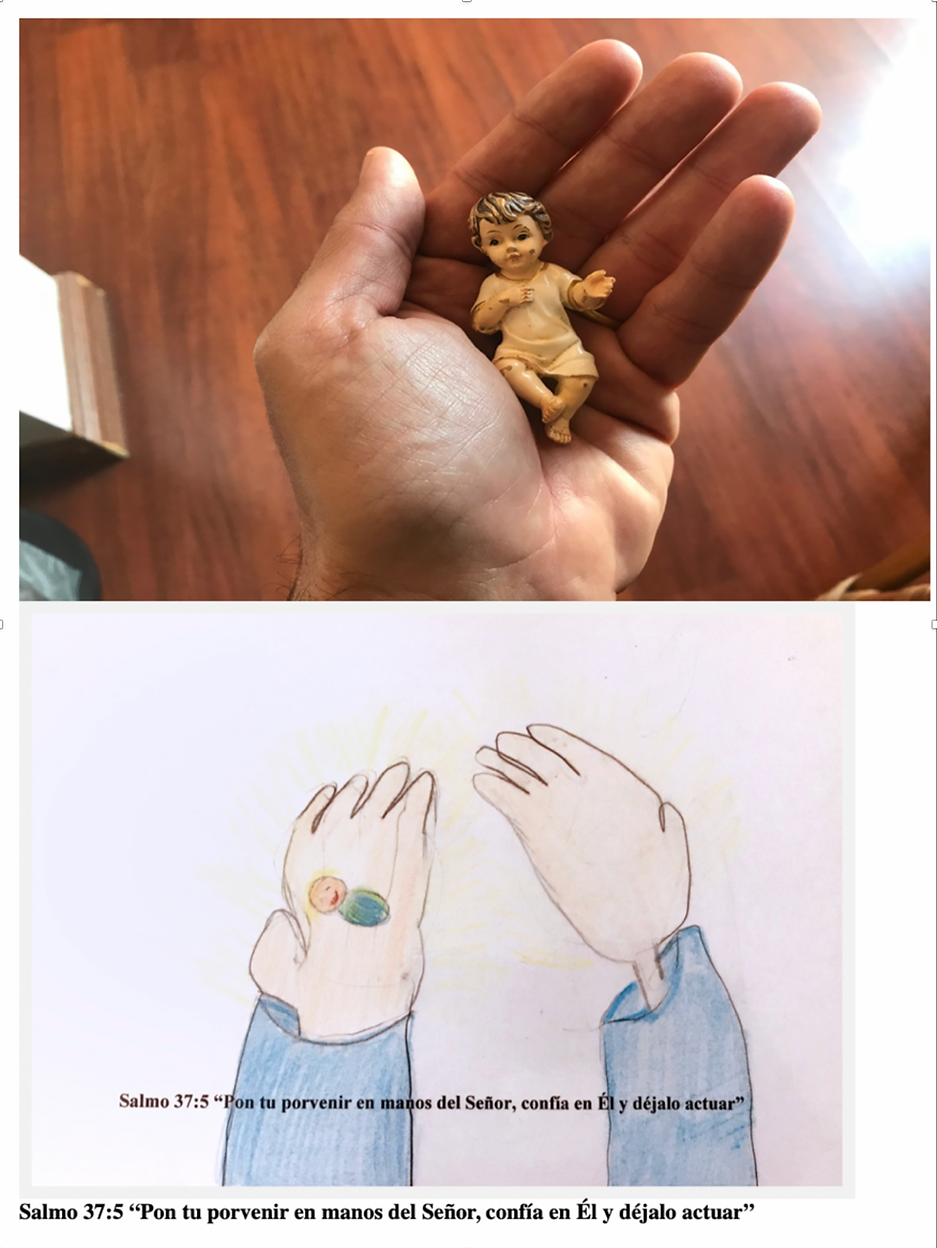 Tres meses después de nuestra compra de los Niños Jesús, en marzo, hice un Retiro en Madrid de un fin de semana y yo, por supuesto, fui con mi Niño Jesús en el bolsillo. En un momento determinado del Retiro, nos daban unos dibujos que habían realizado unos niños y que repartían con total aleatoriedad. Tengo que decir no había contado a nadie que yo llevaba el Niño Jesús en el bolsillo. Cuál fue mi sorpresa cuando me dieron el dibujo. No me lo podía creer, estaba representado mi Niño Jesús en la mano. Exactamente como yo lo agarro. Qué gran “casualidad”.